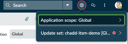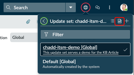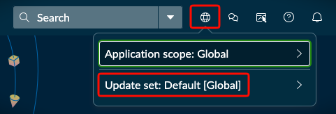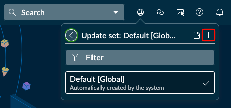To create a new update set, you'll first need to click on the globe icon in the upper right hand area of ServiceNow. From there you'll want to click on "Update set"