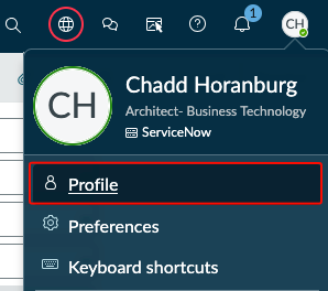 In order to receive these notifications, you will have to enable it in your profile first. In ServiceNow, first click on your profile image, and the view your Profile.
