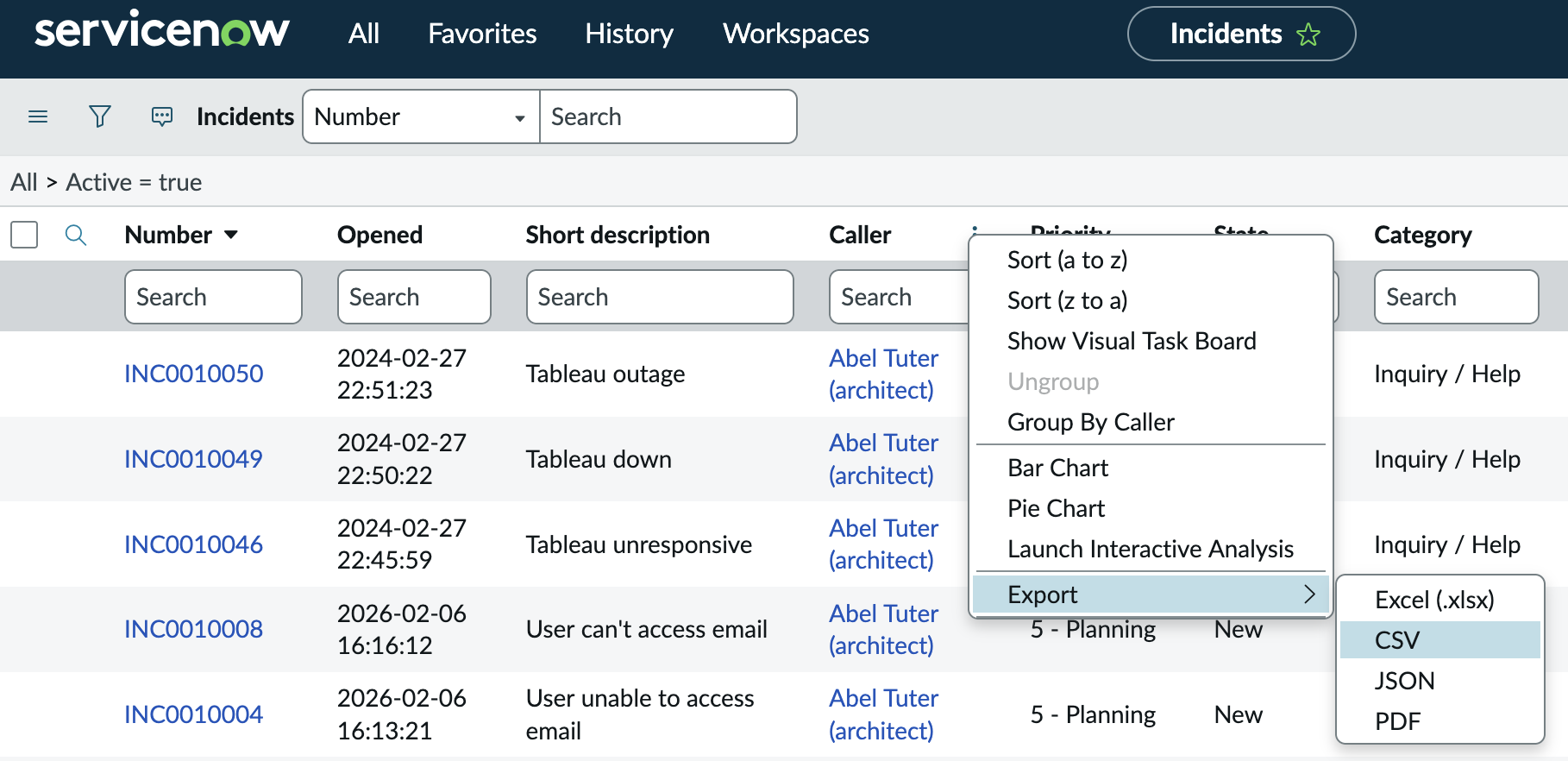 Once your list view is showing you all of the columns you want, you can right click on any column header and select the Export option. I highly recommend using the CSV option instead of Excel, but feel free to experiment. Please note, you will not see all of the options in the below screenshot.