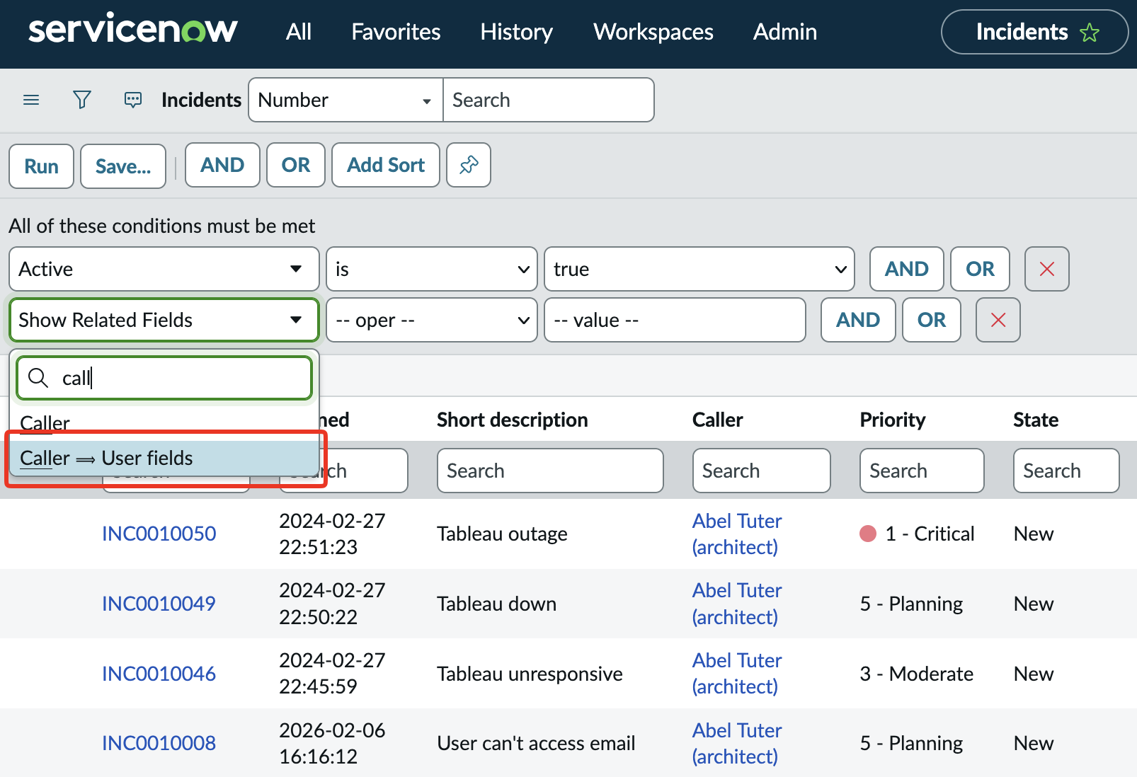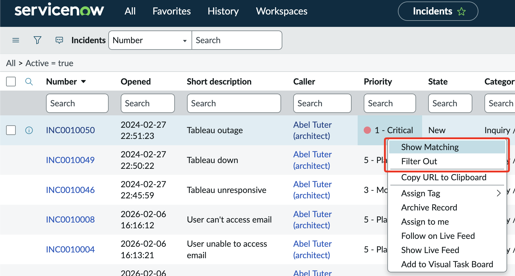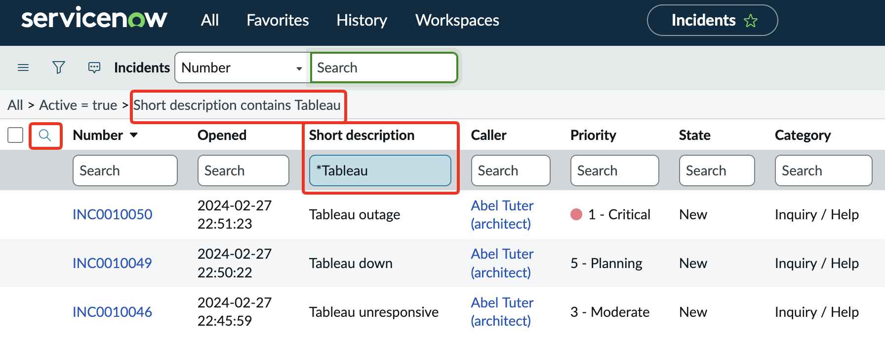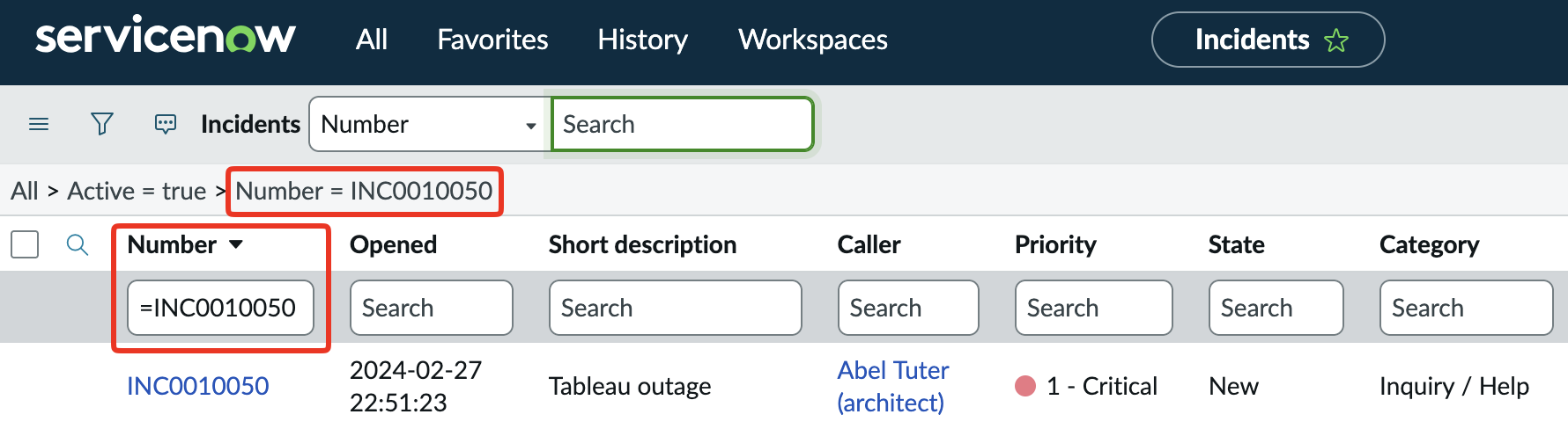 In the above example you’ll see I searched for *Tableau and that * is important. It tells ServiceNow to search all Incidents for any records that contain the word Tableau in the short description. You can also use the = prefix for exact matches.