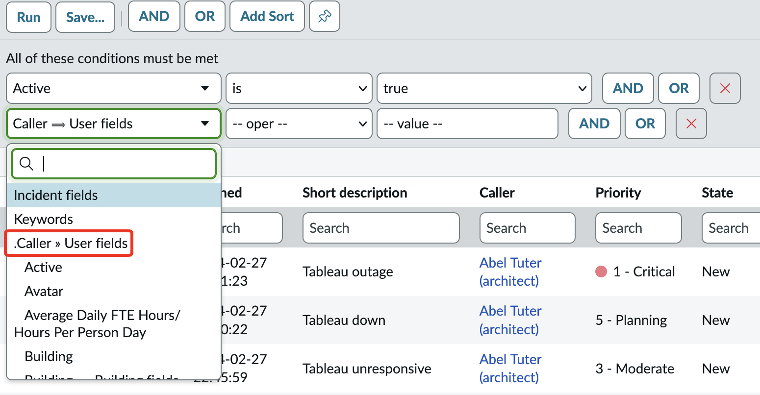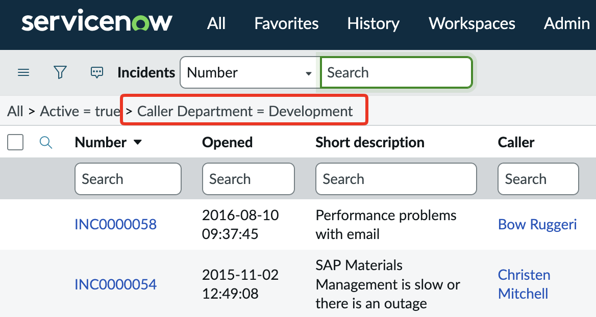 But in reality, the list of fields you can now filter on has grown to encompass any related tables. When you click on the filter box again, you’ll see some entries now have a ==> pointing to another table. For example, if I wanted to search based on Caller but I only wanted to see Incidents where the caller is from the Development group.