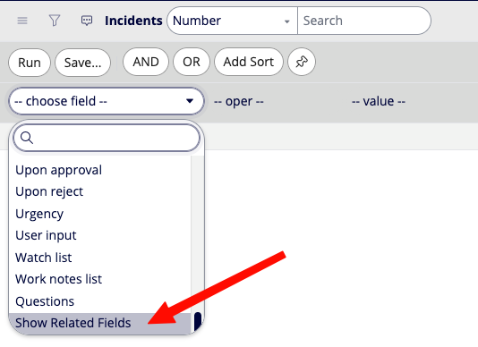 Sometimes you want to filter on a piece of data that’s not on the Incident table, but is related to the Caller (or some other reference field). This is where dot walking comes in, and it’s something you’ll have to first setup. Instead of searching for a field, scroll to the very bottom and you should see Show Related Fields. Click on this and you’ll go back to the same search box, leaving you to think nothing happened.