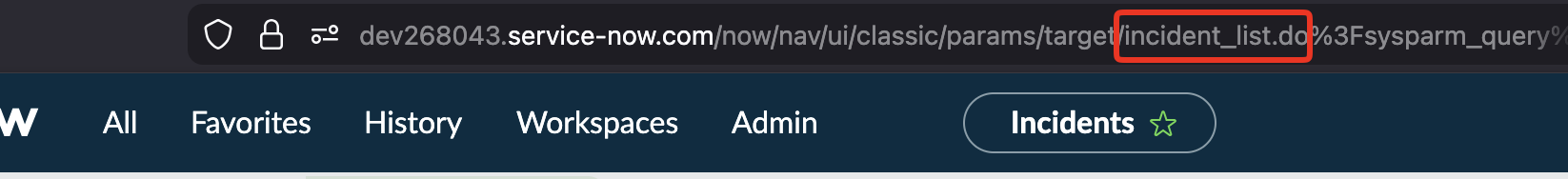 In the above example we see incident_list.do. Our table name here is incident and the _list.do part just says we're in list view.